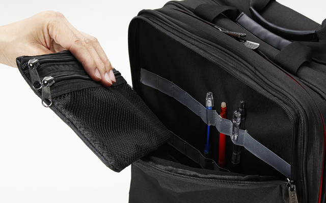 Inside the upper front pocket, elastic bands are provided to securely hold pens, accessories, and even small metronomes (such as the TAMA RW30). Additionally, a small removable pouch is attached to the inside of the front pocket for even more convenient storage options.