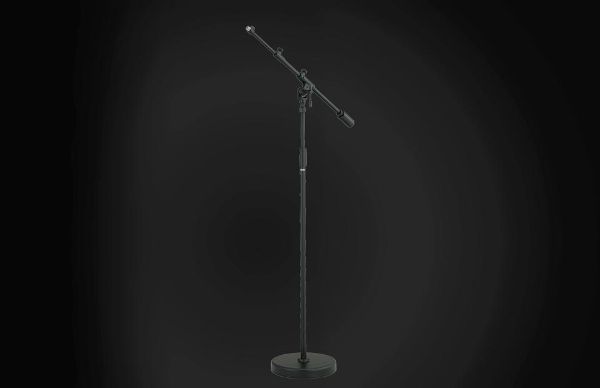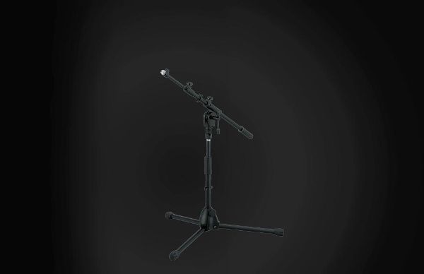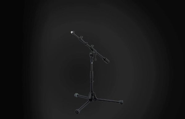 バスドラムやギターアンプ等、ローアングルのマイキングに最適なショートタイプのブームスタンド。照明の乱反射を防ぐブラック仕上げにより、ライヴステージでの使用感も抜群です。